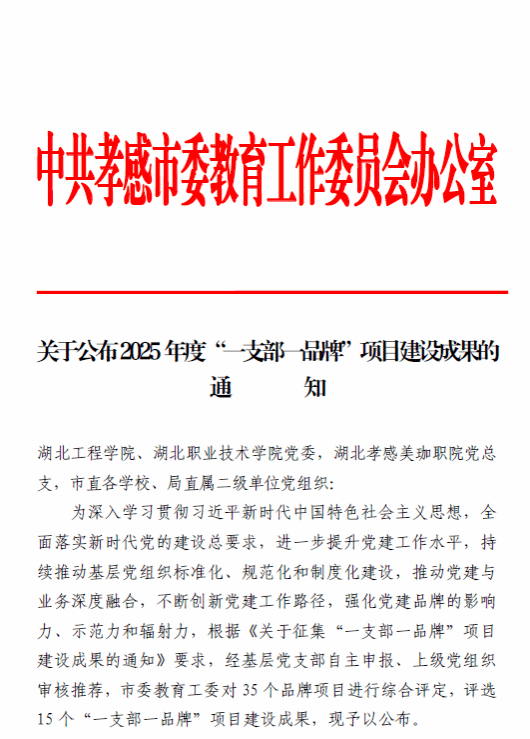近日,中共孝感市委教育工作委员会办公室公布了2025年度“一支部一品牌”项目建设成果评选结果,城市设计系学生党支部申报的“五线谱新章,三引铸红魂”党建品牌在全市35个品牌项目中脱颖而出,成功入选。