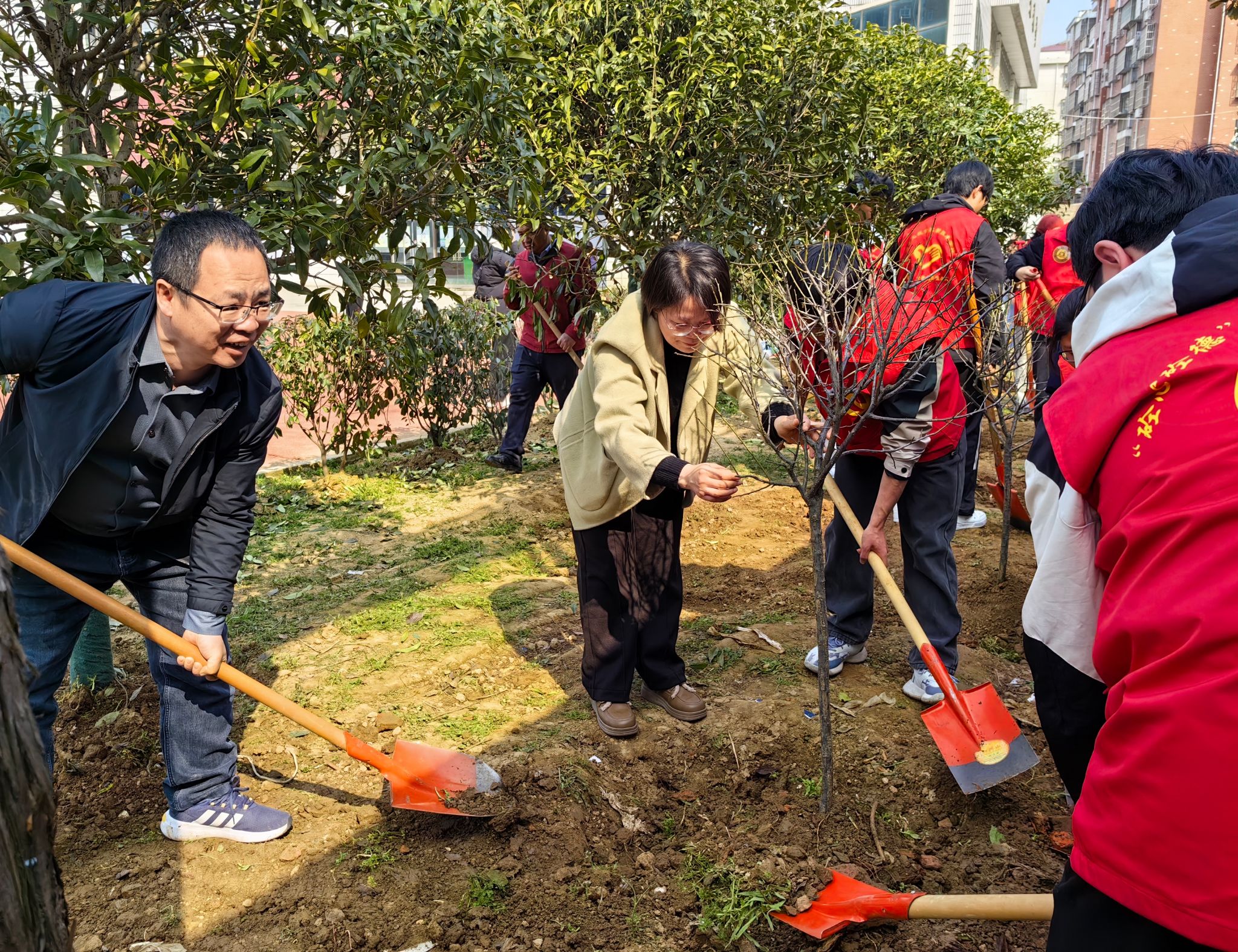 揭牌仪式结束后,雷锋月志愿服务植树活动迅速拉开帷幕。城市设计系学生代表与永新中学初中生代表结对分组,在两校老师的共同指导下,有条不紊地投入到植树劳动中。挥锹挖坑、扶苗培土、踩实浇水,一系列动作规范有序、配合默契,劳动现场热火朝天、暖意融融。两校学子在并肩协作中传递温暖,在挥洒汗水中践行绿色使命,让雷锋精神在劳动实践中落地生根。