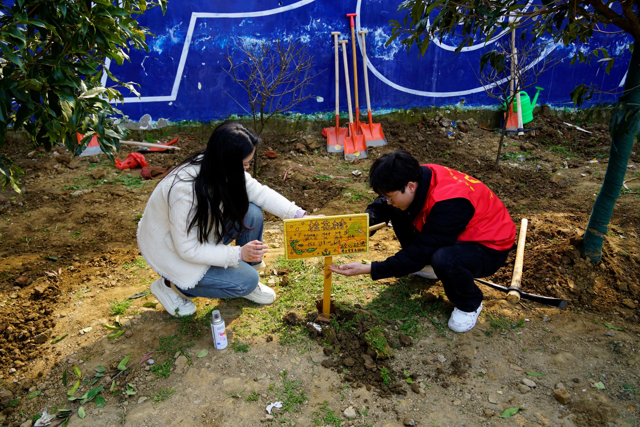植树结束后,两校学生共同开展创意树牌DIY活动。大家拿起彩笔,在树牌上绘制环保图案、书写美好寄语,并郑重签下自己的名字,每一个署名都承载着对小树成长的期盼,也见证着两校学子携手劳动的珍贵瞬间。随后,大家将亲手制作的树牌插在各自栽种的树苗旁,合影留念,定格这份跨越校园的友谊与责任。